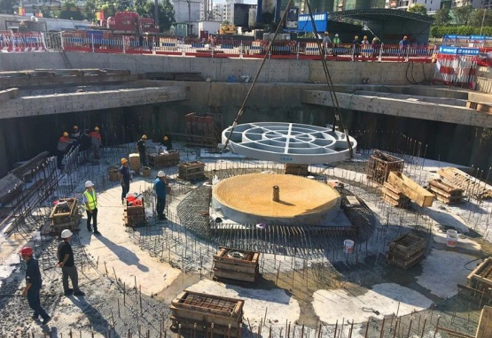 龍巖大橋項目球鉸轉體系統(tǒng)總重達200余噸,設計最大承載能力高達250000KN,相當于2.5個埃菲爾鐵塔,是目前中國建筑系統(tǒng)內承載能力最大的球鉸。上球鉸重量為38t,下球鉸重達48t,直徑達5m,上含1758個滑塊嵌槽,采用下凸面設計,由外向內逐一編號。