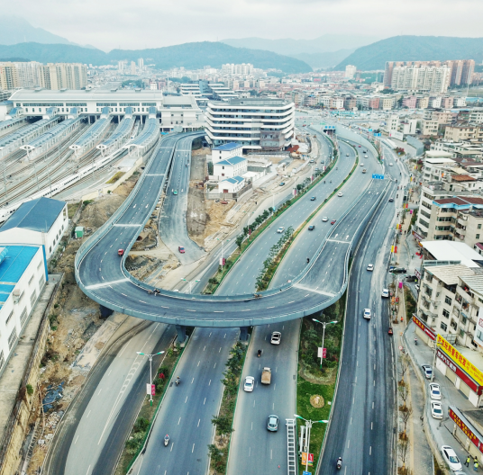 該項目屬于火車站北片區(qū)“一橫一縱一環(huán)”路網(wǎng)中的一環(huán),是火車站北站房片區(qū)的重點工程,也是連接羅龍路與火車站北站房旅客出發(fā)平臺的唯一通道,項目建成對完善片區(qū)功能開發(fā)需要具有重要意義。1月1日起,站前高架橋已順利通車,前往出發(fā)層的市民可從高架橋進入北站房,而到站旅客將從廣場出站,進出分流,交通疏導更加順暢。