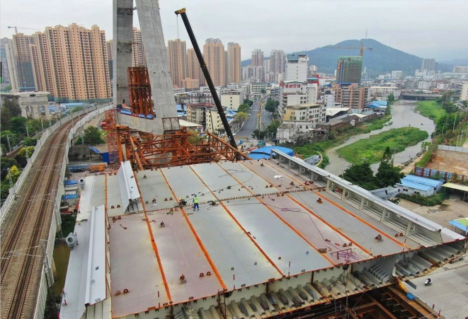 大橋鋼箱梁工程還有19片箱梁,鋼箱梁總長340米,每片質(zhì)量平均290噸,計(jì)劃8月初全部完成吊裝。與此同時(shí),主塔第一次轉(zhuǎn)體計(jì)劃于4月中旬實(shí)施,第二次轉(zhuǎn)體計(jì)劃在8月底,確保年底大橋通車。